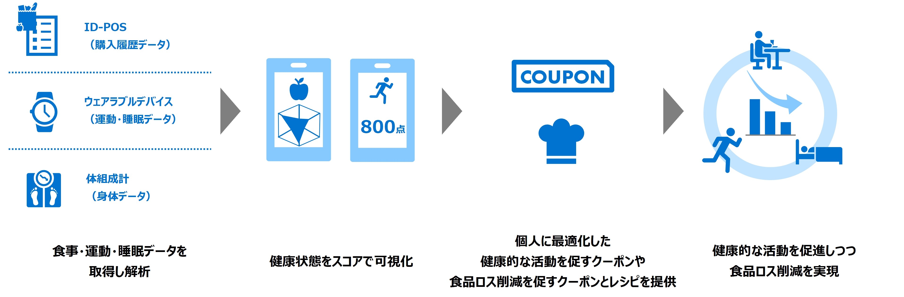 本実証実験は、健康状態に関連するデータを可視化することのほか、健康的な生活の実現のための三要素である「運動」「睡眠」「食事」の改善を促す行動を個人の健康状態に応じて提案したり、インセンティブによる動機付けを行ったりすることによる、生活における健康的な活動を促進する効果を検証するものです。また、併せて、食品の使い切りを意識させる機能による家庭系の食品ロスの削減と、クーポンの活用で商品を売り切ることによる事業系の食品ロス削減の効果も検証します。