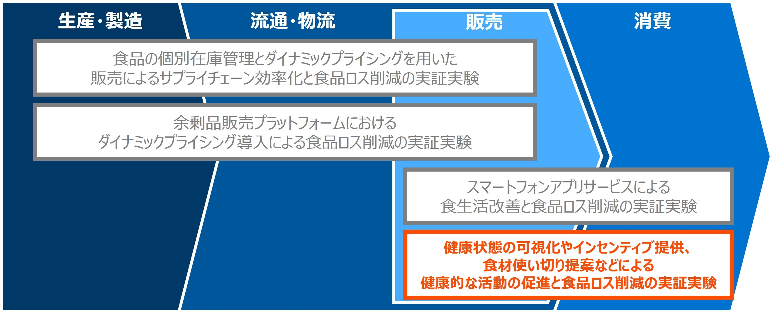 その一つである本実証実験は、消費者行動の変容による食品ロスの削減を目的に、販売から消費までを主な対象として実施します。