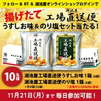 「湖池屋 工場直送便 ポテトチップス」シリーズは、その揚げたて新鮮な風味と食感をご評価いただき、完全受注生産という販売形態をとりながらも、おかげさまで累計500万食を突破しました。この度、いつも「湖池屋 工場直送便 ポテトチップス」をご愛顧いただいているお客様への感謝の気持ちを込めるとともに、まだお召し上がりいただいていない方にも一度お試しいただきたいとの思いから、「工場直送便 ポテトチップス」2品各1箱をセットにしてプレゼントするキャンペーンを実施します。Twitterでのフォロー&リツイートと、湖池屋オンラインショップへの会員登録のみで簡単にご応募でき、はずれてもオンラインショップで使用できる割引クーポンをプレゼントしておりますので、この機会にぜひご登録・ご参加ください。
