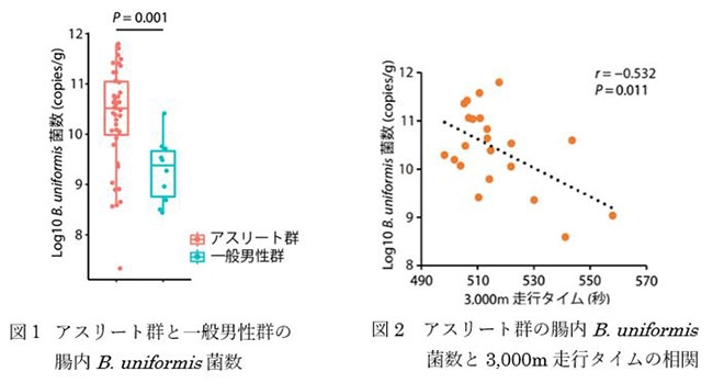 本研究では最初に、この研究の趣旨を理解し協力の承諾を得た青山学院大学 陸上競技部 (長距離ブロック)に所属する48人の男性学生(以下、アスリート群)と、同年代の一般男性10人の腸内フローラの比較調査を行いました。調査の結果、アスリート群の腸内にはヒト腸内フローラの主要な構成菌の1種であるB. uniformis 3)が多く棲息することが明らかとなりました(図1)。さらに、アスリート群のうち3,000mの走行タイムを提供した25人について、腸内フローラにおけるB. uniformisの菌数(本研究では16S rRNA遺伝子1コピーを1菌数と定義)と3,000m走行タイムの関連を調べたところ、B. uniformisの菌数が多いヒトほど3,000mの走行タイムが早いという相関関係を見出しました(図2)。