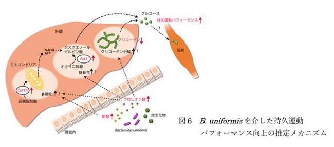 また、B. uniformisによる持久運動パフォーマンス向上のメカニズムとして、この腸内細菌によって腸内で産生される酢酸とプロピオン酸が運動中の肝臓におけるグリコーゲン分解と糖新生5)を促進し、運動に必要なグルコースを全身に供給していると推測されました(図6)。