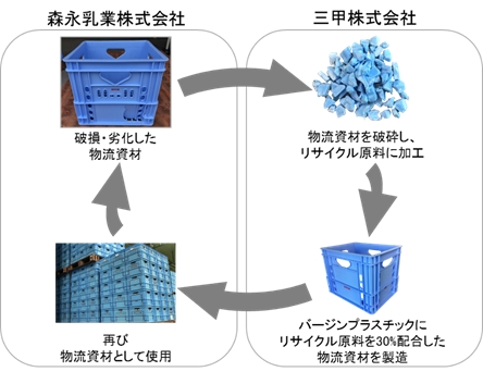 この度、破損・劣化して使用不可となったプラスチック製物流資材(クレート及びパレット)を三甲株式会社(代表取締役社長 後藤利彦)にて破砕し、リサイクル原料へ加工後、リサイクル原料を30%配合したプラスチック製物流資材を製造し、再び森永乳業グループで使用するという、社内プラスチック資源循環の取り組みを開始いたします。本取り組みの対象となる物流資材は、紙パック商品運搬用クレートと常温商品向けパレットです。これにより、物流資材のバージンプラスチック※使用量を年間約50トン削減します。