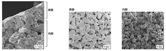 固形化粉ミルクの断面と表面、内部の電子顕微鏡写真