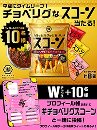 新商品「スコーン チョベリグ!!スパイスカレー」の発売を記念し、当商品を含む「スコーン」4品(合計8袋)を抽選で10名様にプレゼントするキャンペーンを実施します。Twitterのフォロー&リツイートで簡単応募のキャンペーンですが、特製プロフィール帳を記入して「#チョベリグスコーン」をつけて応募すると、さらに+10名様に当たりますので、ぜひご参加ください。
