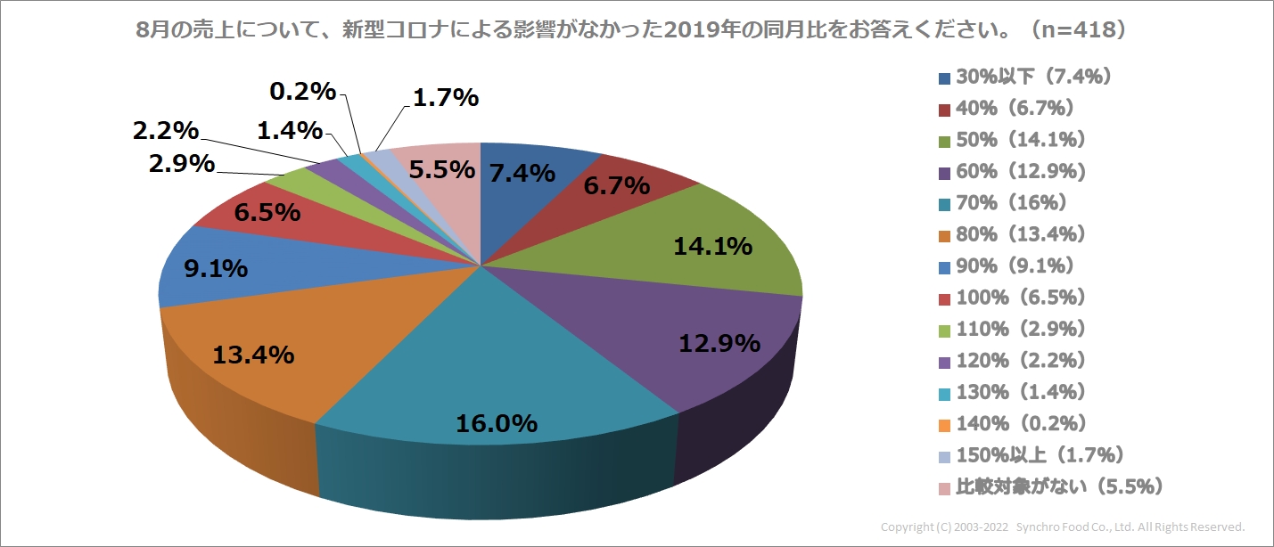 アンケートではまず、飲食店の売上状況について伺いました。2022年8月と新型コロナの影響がなかった2019年8月の売上を比較してもらったところ、以前と売上が変わらない「100%」との回答は6.5%、売上が伸びたという「110%以上」の回答は8.4%にとどまりました。一方で、79.6%の店舗が「90%以下」と回答。今年の8月は、全国的に感染者数が増加していたこともあり、コロナ禍前の売上に満たない飲食店が大多数となりました。また、売上が半分以下(「50%以下」)との回答も28.2%見られ、依然として厳しい状況に置かれている飲食店が多いことがわかります。