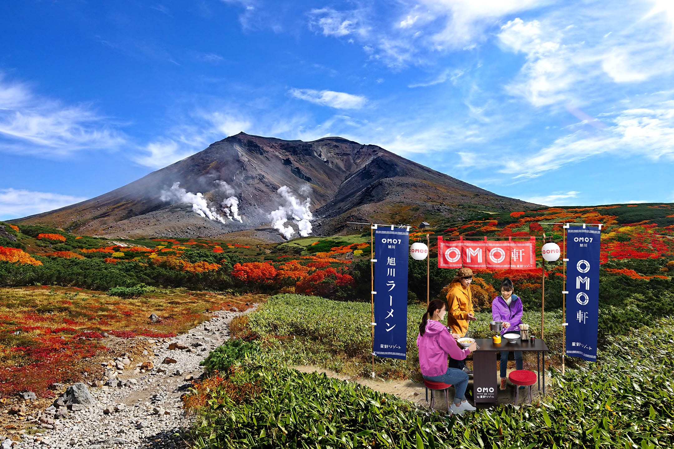 旭川を楽しみ尽くす「街ナカ」ホテル「OMO(おも)7旭川 by 星野リゾート」は、2023年9月1日から30日まで、北海道一標高が高い大雪山旭岳(以下旭岳)で、日本一早い紅葉を眺めながら旭川ラーメンを食べる「旭岳紅葉ラーメンツアー」を開催します。本ツアーは旭川の街を愛するご近所ガイドOMOレンジャー*(以下OMOレンジャー)が、旭岳で紅葉が綺麗に見えるスポットへご案内。そこで、旭川を代表するグルメである「旭川ラーメン」を食べることができるツアーです。3度目の開催となる今年は、新たに山の上にラーメン屋台を模した特別席が登場。よりラーメン屋に近い雰囲気の中で、紅葉と旭川ラーメンを楽しめるように進化しました。