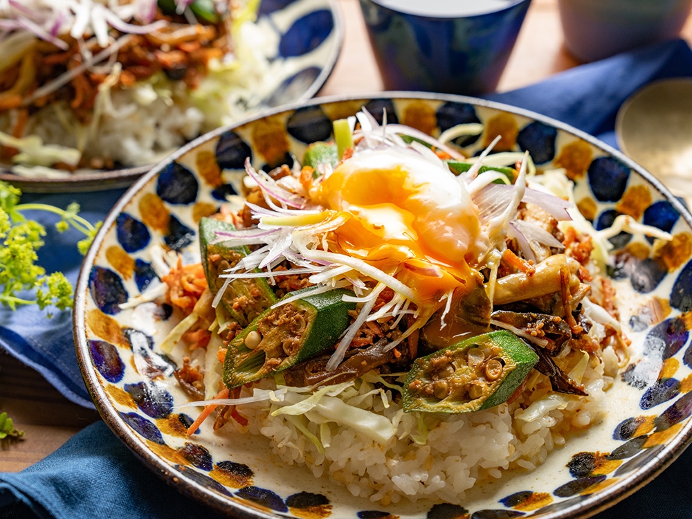 商品詳細:6種の夏の彩り野菜とそぼろ、温泉たまごを添えたビビンバ丼。寺井幸也さんの優しい味付けはそのままに、甜麺醤とナンプラーを使うことで食欲をそそるエスニックな味付けに。