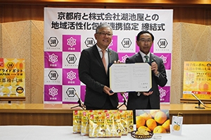 株式会社湖池屋(本社:東京都板橋区/社長:佐藤章)は、「湖池屋 京都工場」の所在地である、京都府の地域活性化及び府民のみなさまへのサービスの向上を図るため、京都府と「地域活性化包括連携協定」を締結し、2023年7月31日(月)に協定締結式及び新商品発表会を京都府庁にて実施しました。
