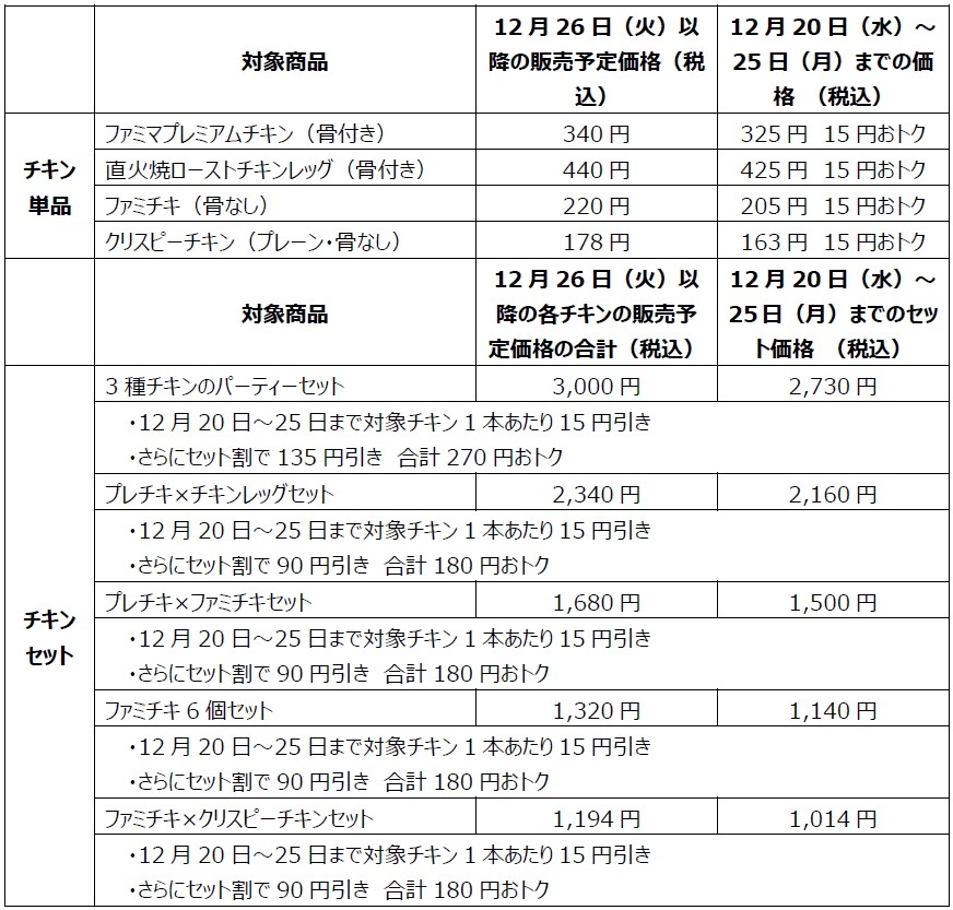 対象のチキン商品を12月20日(水)~12月25日(月)の期間に購入すると、1本購入で15円引き、セット購入で1本あたり30円引きになります。