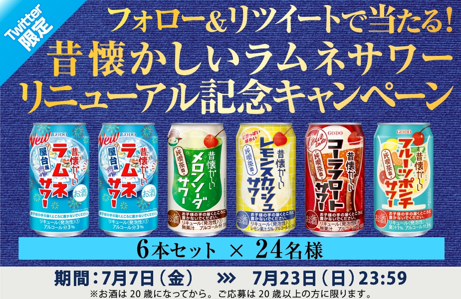 | 内容 | オエノングループ公式Twitterアカウントをフォローして、7月7日(金)の「昔懐かしいラムネサワーリニューアル記念プレゼントキャンペーン」のTwitter投稿をリツイートすると、「昔懐かしいラムネサワー」を含むチューハイ6本セットを抽選で24名様にプレゼント。 |
