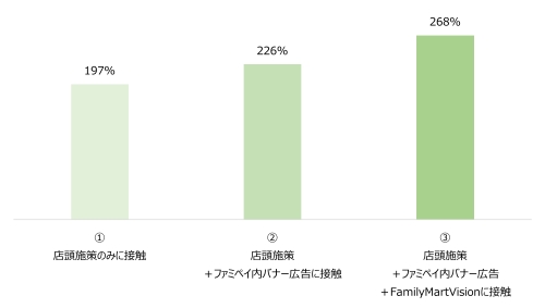 また、店頭施策、ファミペイアプリ内バナー広告、FamilyMartVisionの接触状況別で購買件数の上昇率を検証したところ、ファミペイ内バナー広告とFamilyMartVisionの両方に接触したグループの購買件数の上昇率が268%と最も高い数値を示しました。