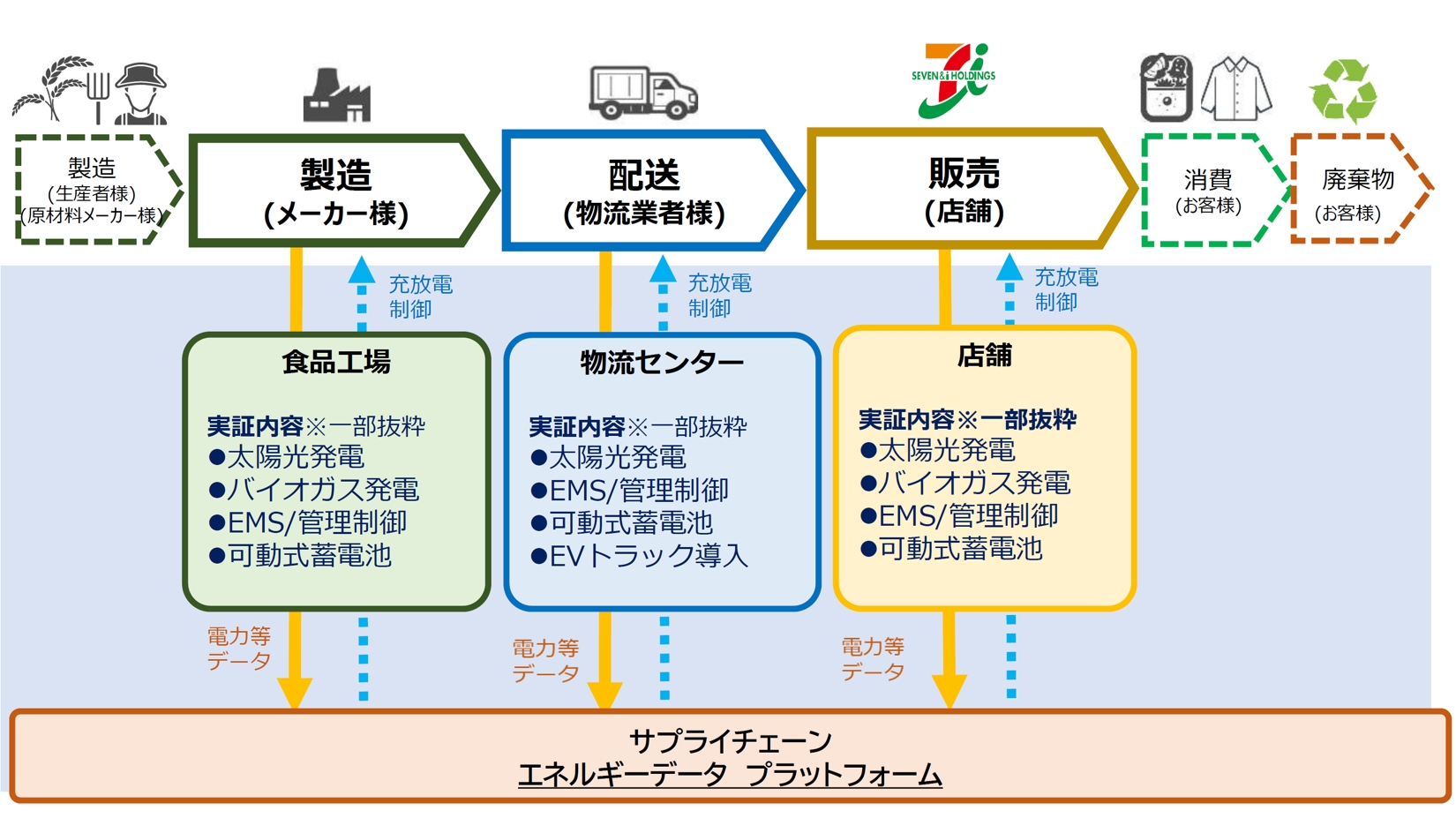 都内のセブン&アイグループ店舗およびお取引先様である食品工場、物流センターを拠点としたEVトラック、太陽光発電、バイオガス発電等の
