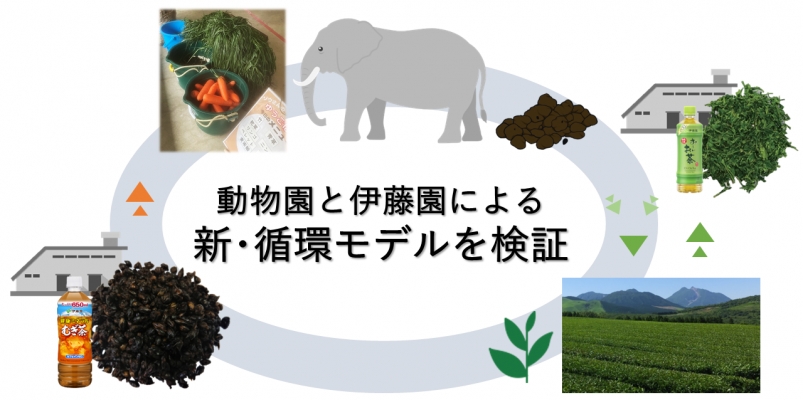 この循環モデルは、まず当社が展開するむぎ茶飲料製品の製造過程で排出する「むぎ茶殻」を、京都市動物園で飼育するアジアゾウの餌に混ぜ込み代替飼料として活用します。そして、給餌したアジアゾウが排出する糞を、当社が茶産地で検証を続けている緑茶殻の堆肥化技術を応用し、緑茶殻入りゾウ糞堆肥として当社の契約農家が展開する茶畑に散布する新しい循環モデルの試みです。