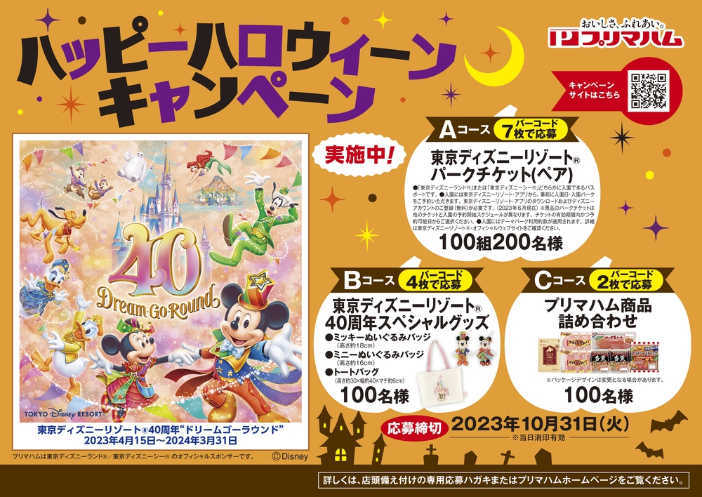 例年大変なご好評を賜り、多くのお客様からご応募いただいておりますプリマハムの「ハッピーハロウィーンキャンペーン」を今年もご用意させていただきました。キャンペーン景品には、今年4月に開園40周年を迎え、ますます人気の高まる東京ディズニーリゾート(R)のパークチケットに加え、今しか入手できない東京ディズニーリゾート(R)開園40周年記念スペシャルグッズ、ご家族皆様に喜んでいただける「プリマハム商品詰め合わせ」もご用意いたしました。