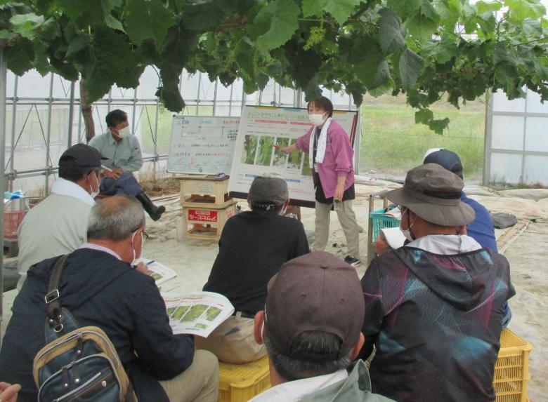 栗原農業改良普及センターでは、水稲育苗ハウスを活用したシャインマスカットの栽培者が増加していることから、栗原地域産地戦略プランの地域戦略品目に位置付け、管内のシャインマスカット栽培者の技術向上と情報共有を目的とした栽培研修会を開催しています。