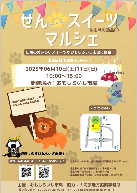 仙南地域のお菓子屋さんをおもしろいし市場に集めた「せんにゃんスイーツ&地域の逸品PRマルシェinおもしろいし市場」を開催します!