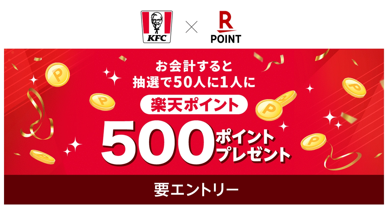 エントリー期間中にエントリーのうえ、キャンペーン期間中に全国のKFC店舗で「楽天ポイントカード」を提示し、200円(税抜)以上の会計をした方の中から抽選で、50人に1人に「楽天ポイント」500ポイントを進呈します。なお、抽選に外れた場合でも全員にもれなく、「楽天ポイント」1ポイントを進呈します。