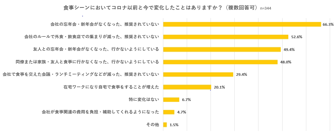 ・食事シーンにおいてコロナ禍以前と変化したことで最も多かったのは、「会社の忘年会・新年会がなくなった、推奨されていない」の66.3%、次点で「会社のルールで外食・飲食店での集まりが減った」の52.6%であった。