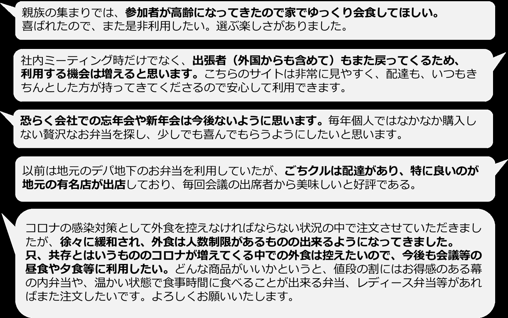 2022年12月においては、コロナの感染対策を意識する一方で、美味しい食事を楽しみたい法人・個人のお客様よりお引き合いをいただき、月間過去最高件数のご注文をいただくこととなりました。一方、アンケートのフリーコメント欄には、今回の注文を踏まえ、コロナの感染を問わず、また「ごちクル」を利用したいという声が数多く寄せられましたので、その一部をご紹介いたします。