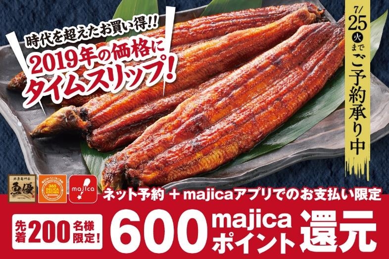 ユニー株式会社(本社:愛知県稲沢市、代表取締役社長:関口憲司、以下「ユニー」)は、2023 年 6 月 26 日(月)より、土用の丑「魚優(うおゆう)店焼きうなぎ」のネット予約を開始しました。7 月 25 日(火)までの予約期間中、対象商品をネットでご予約いただいた先着200名様※1に、majica(マジカ)600ポイントを還元いたします。