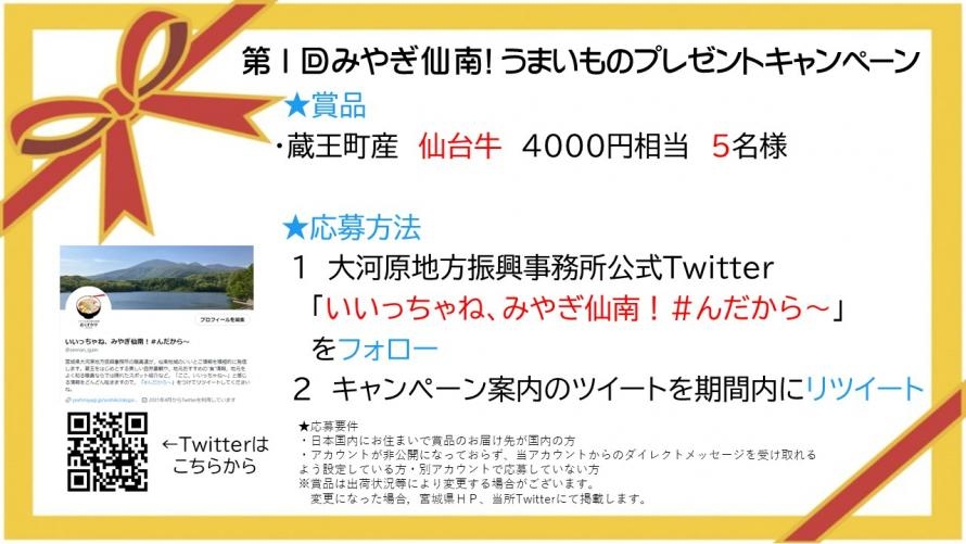 今年度は昨年に引き続き、大河原地方振興事務所公式Twitter「いいっちゃね、みやぎ仙南!#んだから~」にて、仙南地域の特産品が当たる「みやぎ仙南!うまいものプレゼントキャンペーン」を年2回開催します!