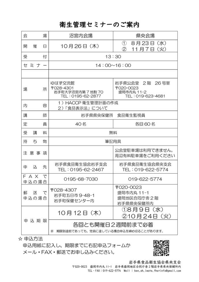 申込先 岩手県食品衛生協会 県央支会(盛岡市内丸11-1 盛岡地区合同庁舎内)