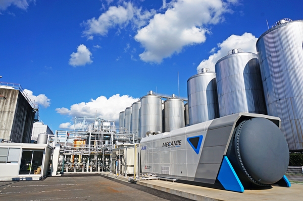 アサヒビール茨城工場に設置されたバイオメタンガス精製装置と、精製バイオメタンガスで発電している200kW固体酸化物型燃料電池(SOFC)