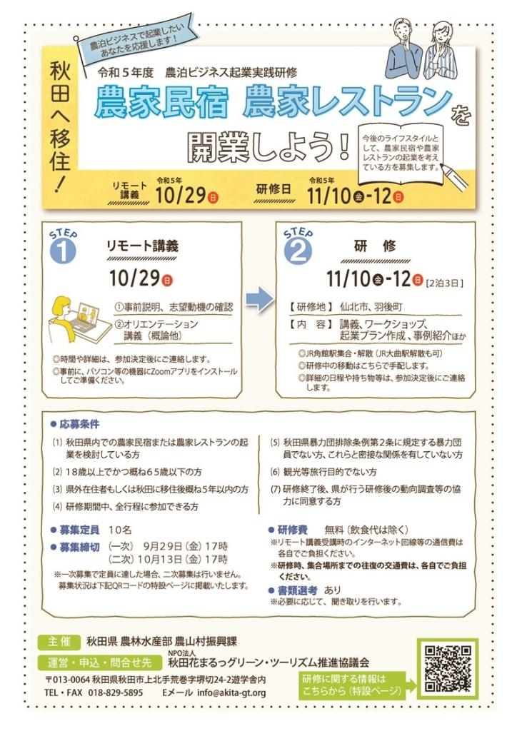 農家民宿や農家レストランなどの農泊ビジネスの起業による秋田県への移住・定住を具体的に支援するための研修として、起業プランの作成や起業・経営に係る知識習得及び農泊ビジネス実践者の下での実務体験等を実施します。
