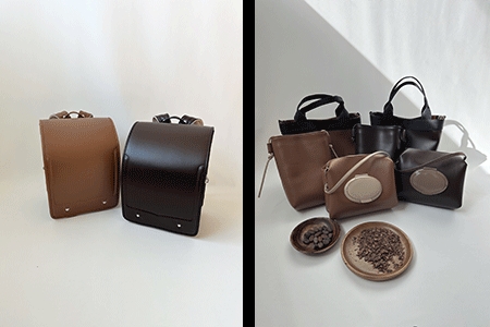 さらにDIC株式会社、株式会社加平との協業で、カカオのアップサイクルにより実現したレザーを使用したランドセルやバッグなどを展示します。