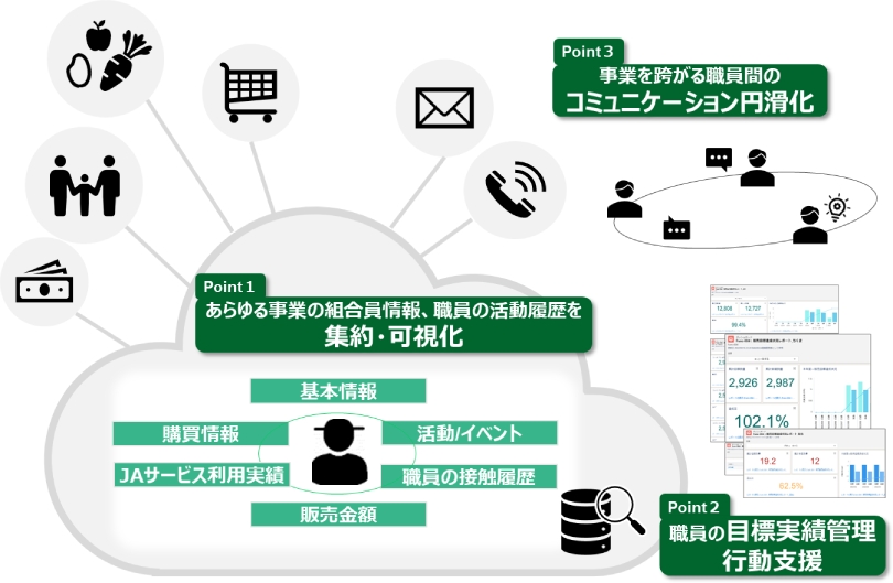 本サービスは、営農データや行動データなどJA組合員に関わるあらゆる情報を集約し、組合員との接点強化および職員の事業成果向上を支援する総合事業の業務支援サービスです。組合員情報および職員の活動情報の集約・可視化、職員の目標実績管理・行動支援、職員間の情報共有・連携が実現できます。