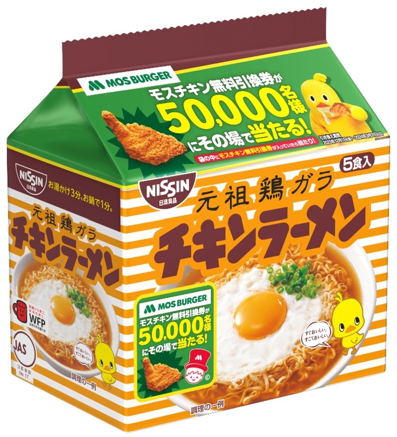 「チキンラーメン」を買って "あたり" が入っていたら、「モスチキン」がもらえる! 日清食品の創業者・安藤 百福 (あんどう ももふく) が発明した世界初のインスタントラーメン「チキンラーメン」は、1958年8月25日の発売以来、幅広い層の方々からご愛顧いただいているロングセラーブランドです。今回、人気ハンバーガー店の「モスバーガー」とコラボした「チキンラーメン モスチキンプレゼントキャンペーン」を実施します。キャンペーン限定パッケージ*の「チキンラーメン 5食パック」をお買い求めいただき、外袋に "あたり" と書かれたカードが入っていれば、「モスバーガー」の店頭レジにて「モスチキン」1本と引き換えができる「モスチキン無料クーポン」をプレゼント (総計50,000名) します。