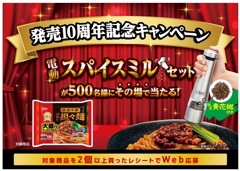 日清食品冷凍株式会社 (社長:上和田 公彦) は、「冷凍 日清中華 汁なし担々麺 大盛り 電動スパイスミルセットが500名様にその場で当たる! キャンペーン」を12月15日(金)から実施します。