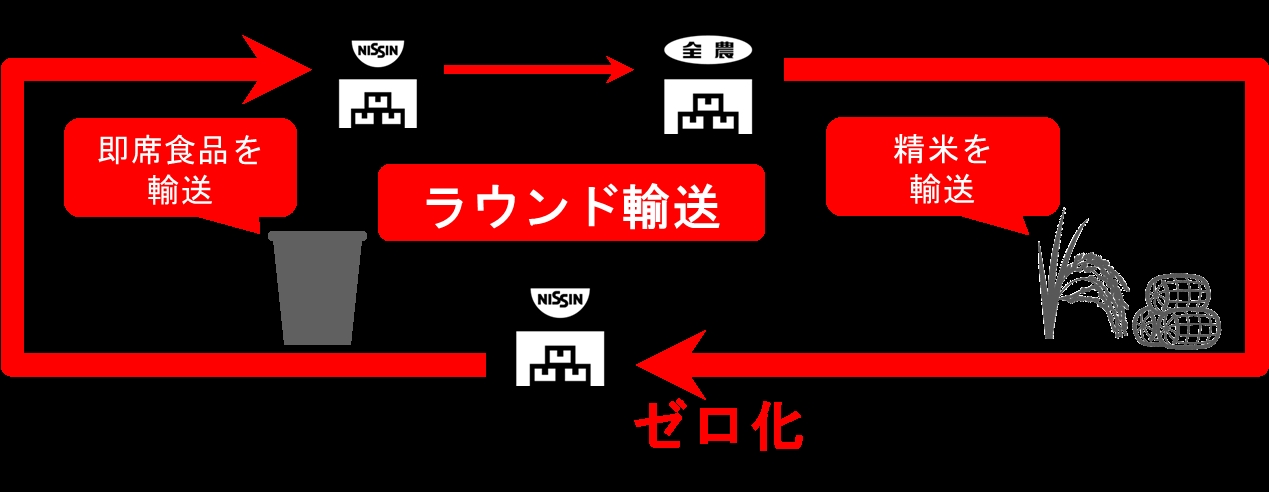 福岡にあるJA全農の精米工場から山口にある日清食品の生産工場へカップライスの原料米をトラックで輸送した後、同工場で製造された即席食品を同じトラックで福岡にある日清食品の製品倉庫へ輸送します。