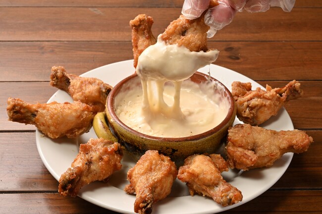 熱々のチキンにチーズをたっぷりディップして。