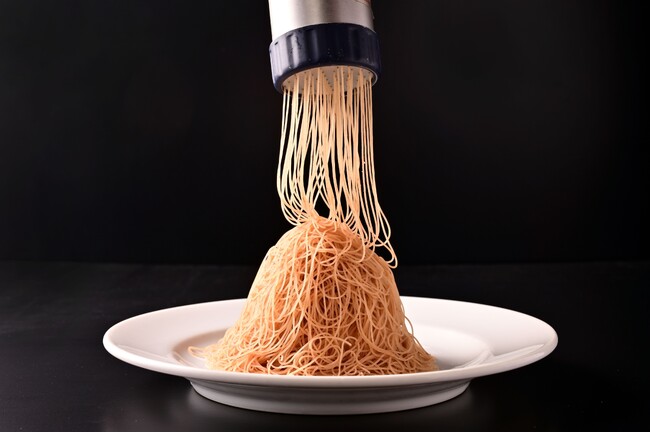搾り機を使用してマロンペーストをお客様の目の前で一つ一つ丁寧に生搾りします。糸のように細く織りなすので、繊細で軽やかなくちどけです。