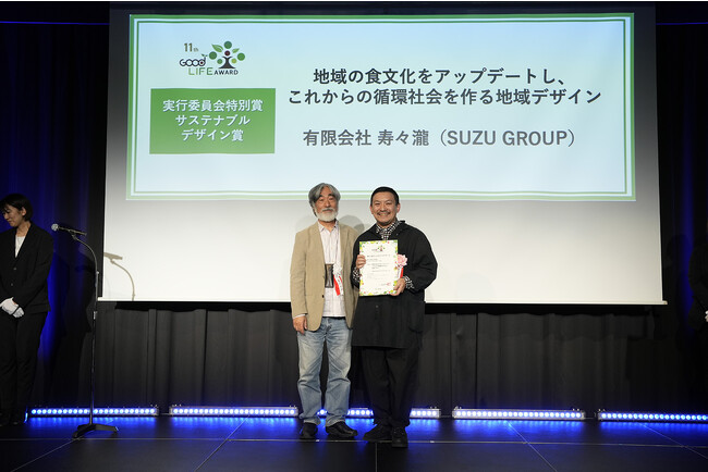 有限会社 寿々瀧(本社:新潟県長岡市/代表取締役:鈴木 将)は、第11回環境省グッドライフアワードにおいて「実行委員会特別賞 サステナブルデザイン賞」を受賞いたしました。グッドライフアワードとは、環境に優しい社会の実現を目指し、日本各地で実践されている環境と社会に良い活動を応援するプロジェクトです。この度、SUZU GROUPの事業の中心となる『地域の食文化をアップデートし、これからの循環社会を作る地域デザイン』について、実行委員長である益田 文和氏(株式会社オープンハウス 代表取締役/デザインコンサルタント)にご評価いただきました。