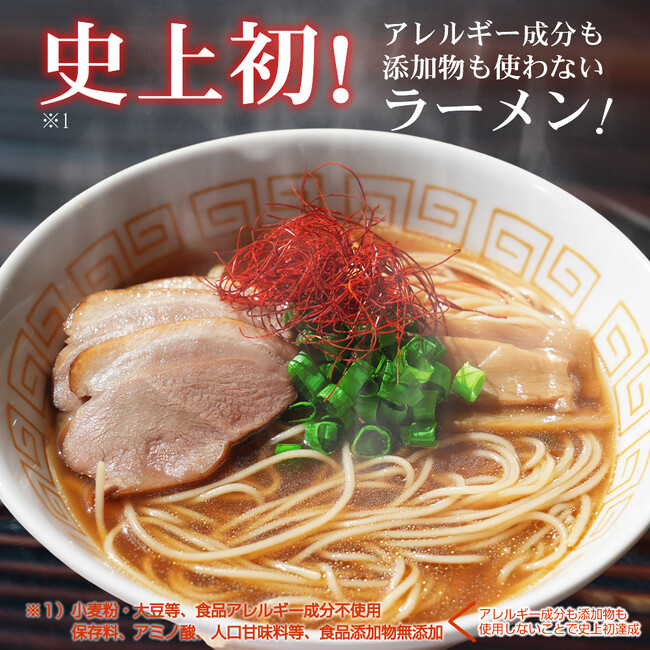 日本で販売されているネット販売及び、量販店の流通可能な麺及びスープ付きラーメン(冷凍、冷蔵、常温)の中で、特定原材料28品目不使用かつ厚生労働省が指定する全ての添加物が無添加という括りで、史上初