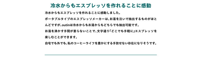 そんな方のために、「冷水3分。自動で簡単にプロの味」を実現できるOutin Nano。外出先でも映える軽量なスタイリッシュデザイン、USB充電、エコ素材、アメリカーノ、エスプレッソ、アフォガードなど豊富な楽しみ方。