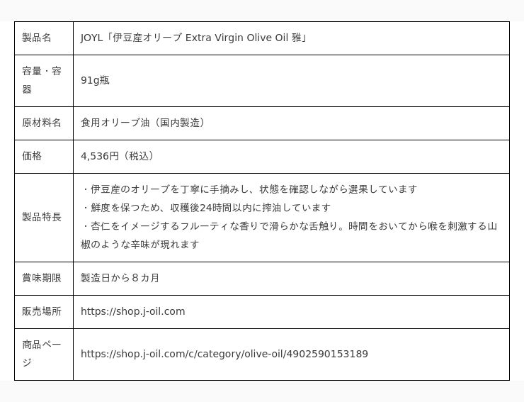 株式会社J-オイルミルズ(東京都中央区、代表取締役社長執行役員 CEO:佐藤 達也 以下当社)は、伊豆急ホールディングス株式会社(静岡県伊東市、代表取締役社長:土方 健司、以下「伊豆急 HD」)とともに、JOYL「伊豆産オリーブ Extra Virgin Olive Oil 雅」を12月7日(木)15時より100本限定で発売します。製品は当社公式オンラインショップ( https://shop.j-oil.com )限定で販売します。当社は、東急株式会社(東京都渋谷区、代表取締役社長:堀江 正博、以下「東急」)および伊豆急 HDが2013 年に開始した「伊豆オリーブみらいプロジェクト」に2019年より参画し、伊豆でのオリーブ栽培および伊豆産オリーブのブランド化に携わってまいりました。同プロジェクトの一環として、伊豆の農園で今年収穫されたオリーブを伊豆高原にある搾油所で搾り、当社の風味官能評価等を経て今回初めて製品として販売します。