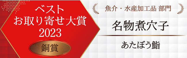 日本最大級のお取り寄せの情報サイト「おとりよせネット」にて、年間で最も優れたお取り寄せ商品を決定する「ベストお取り寄せ大賞2023」が2023年10月4日に発表され、『名物煮穴子』が「魚介・水産加工品部門」で銅賞を受賞しました。