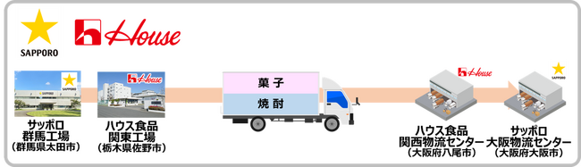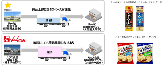 サッポロホールディングス(株)のグループ企業であるサッポログループ物流株式会社(代表取締役社長:田島 一孝、以下サッポログループはサッポロ)とハウス食品株式会社(代表取締役社長: 川崎 浩太郎、以下ハウス食品)は、北関東~大阪間でサッポロビールが扱う「こくいも」(甲乙混和焼酎)などの酒類とハウス食品のスナック菓子「オー・ザック」を組み合わせた、トラック共同輸送を12月11日から開始します。