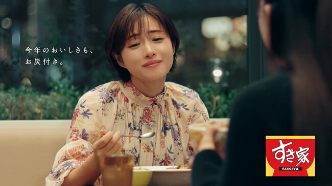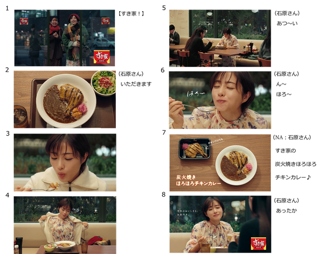 新TVCM「暑くなる」篇は、石原さんが友人と一緒にすき家で「炭火焼きほろほろチキンカレー」を食べて暑くなっていく様子を描いたCMです。寒い冬空の下、マフラーやニット帽を身に着けた姿ですき家を訪れた石原さん。スパイシーなカレーを食べて徐々に暑くなり、「あつ~い」と、ついには上着を脱いで本気モードに!さらにほろほろのチキンを頬張り、「ほろ~」とおいしさを噛みしめる石原さんの様子にも注目です。