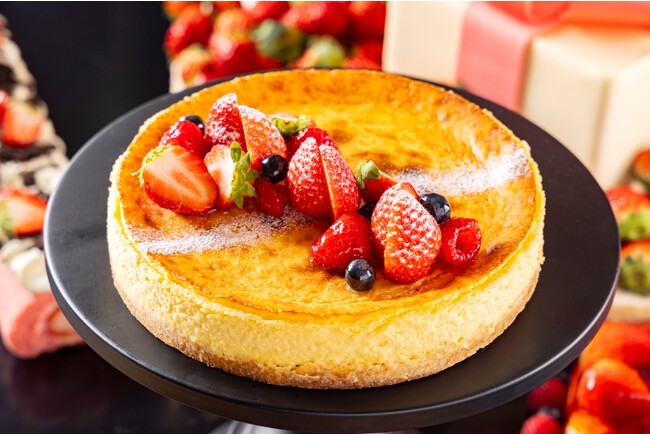 砕いたグラハムクッキーを底に敷いて焼き上げた濃厚なチーズケーキに、フレッシュストロベリーやラズベリーなどでデコレーション。