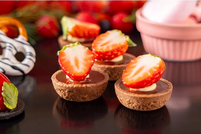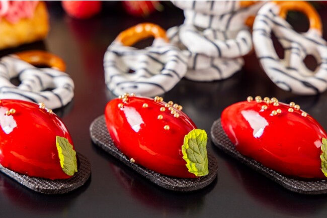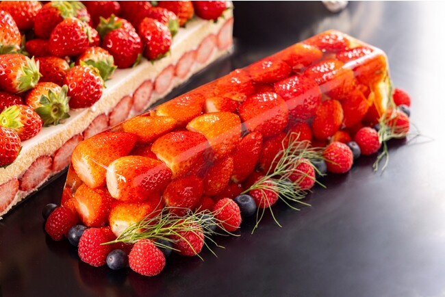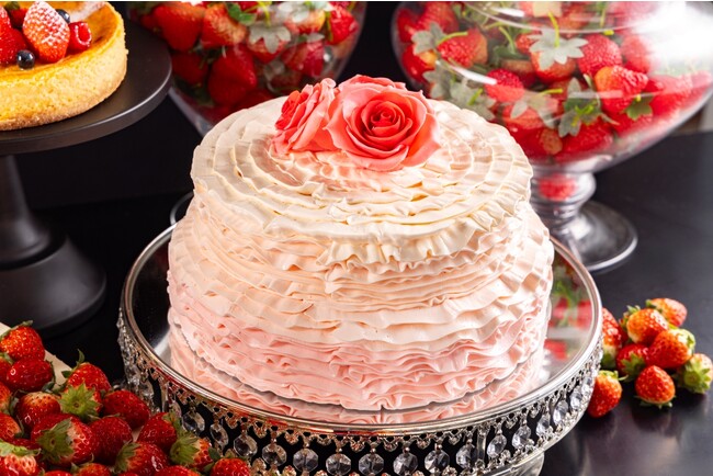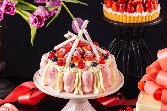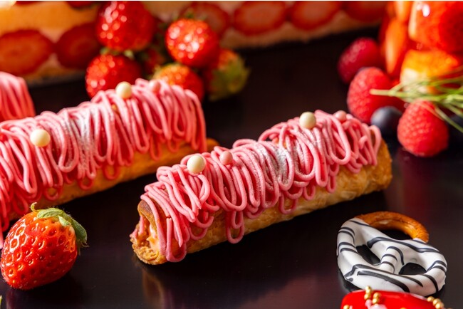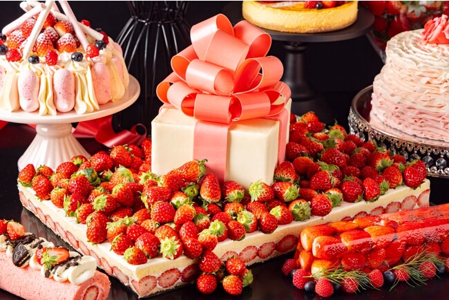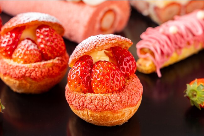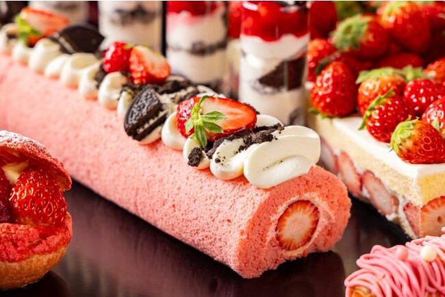 フレッシュないちごをノンアルコール白ワインゼリーにぎっしり詰め込んだ「ストロベリーゼリーテリーヌ」は、切り分けた断面も美しい“萌え断”スイーツに。「ノスタルジーピンク」はライチといちごを組合わせたムースにクリームをレース状に重ねて華やかに彩り、どこか懐かしくも洗練されたリッチな味わいに仕上げました。しっとりと焼き上げたスポンジにいちごと生クリームをたっぷりサンドした「ストロベリーショートケーキ」、贅沢にいちごをあしらいジュエリーのような美しさの「ストロベリータルト」、いちごをカスタードクリームと一緒にストロベリースポンジで巻きあげブラッククッキーやいちごをトッピングした「ストロベリーロールケーキ」など、王道のいちごスイーツも存分にお楽しみいただけます。その他、メレンゲをストロベリーカラーで焼き上げたサクサク食感の「フラワーポップ」、ピンク色に焼き上げたクッキーシューに、フレッシュないちごとストロベリーカスタードクリームをたっぷり詰めた「ストロベリーシュークリーム」など、旬ないちごを贅沢に使用したスイーツが並びます。さらに、ほのかな塩味のあるプレッツェルをホワイト&ブラックチョコレートでデコレーションした「プレッツェル」や、砕いたブラッククッキーとクリームを重ねてストロベリークーリーを添えた「ブラックベリーヌ」など、“ブラック”ないちごスイーツもご用意。シェフ厳選の東海地方中心のフレッシュいちごもお好きなだけお召し上がりいただけます。