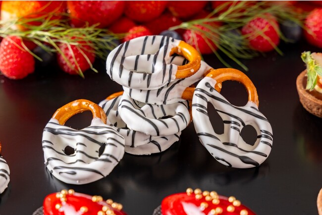 リボンのような結び目が特徴のプレッツェルをホワイト&ブラックチョコレートでデコレーション。ほのかな塩味とカリッとした食感が楽しめます。