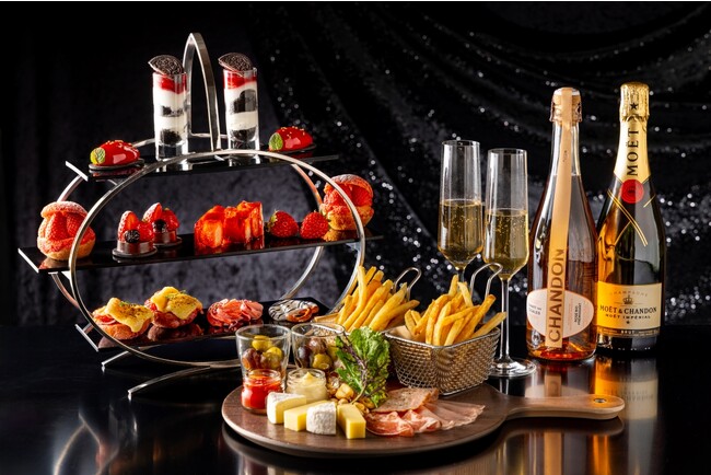いちごスイーツ8種類、シャルキュトリー、チーズ&ナッツ、トリュフ風味のフライドポテト、オリーブマリネなどのセイボリー8種類をご用意しました。お酒とご一緒にお楽しみいただける飲み放題プランをはじめ、豊富なドリンクオプションもご用意しています。