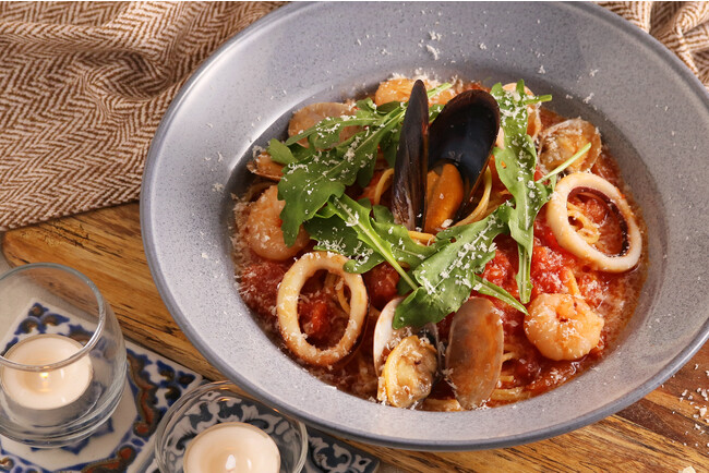 トマトソースの酸味と魚介の旨味をバランス良く仕上げ、チーズをかけてコクをプラス。