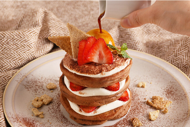 カカオ香るココア味のパンケーキに濃厚なマスカルポーネクリームと