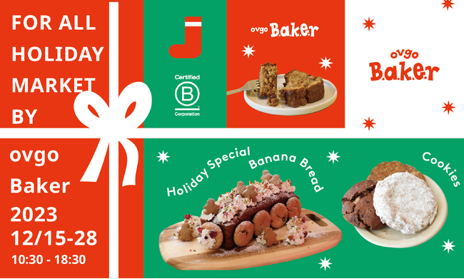 株式会社ovgo(オブゴ、所在地:千代田区西神田2-5-2 TASビル1F)が展開するアメリカンベイクショップ ovgo Baker(オブゴベイカー)は、12/15(金)~12/28(木)の期間限定で伊藤忠Garden(東京都港区外苑前駅出口 4a より 徒歩2分)にある「ITOCHU SDGs STUDIO RESTAURANT 星のキッチン Hanare」に「For All Holiday Market by ovgo Baker」をオープンいたします。