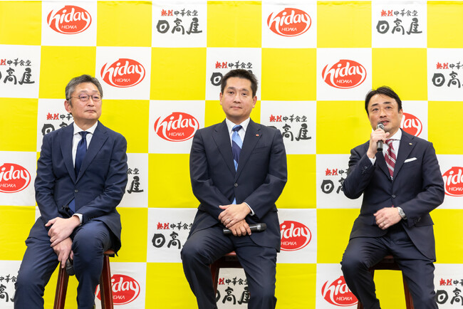 続いてのトークセッションでは、キリンビール(株)の江田雄太執行役員も加わり、ハイデイ日高の青野社長からは「実は日高屋のドリンクの中では、不動の一番人気は、生ビールです。今回ドラゴンハイボール(R)が仲間入りしたことで、本日お2人に挟まれた形になりまして、、、焦っております。まずはドラゴンハイボール(R)をデビューさせて売り出しに力を入れるのはもちろん、一番人気のビールも変わらずに推していき、どちらも相乗効果で売っていきたいと思います!」との、ドリンクメニュー二枚看板宣言。
